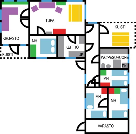 the villa to the sauna, grill and barn. Numbers of persons: 8+4 persons. Facilities and equipment: 4 bedrooms, kitchen,