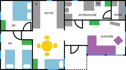 WC, sauna+suihku, sähkö, sähkölämmitys, jääkaappi/pakastin, sähköliesi+uuni, astianpesukone, mikroaaltouuni,